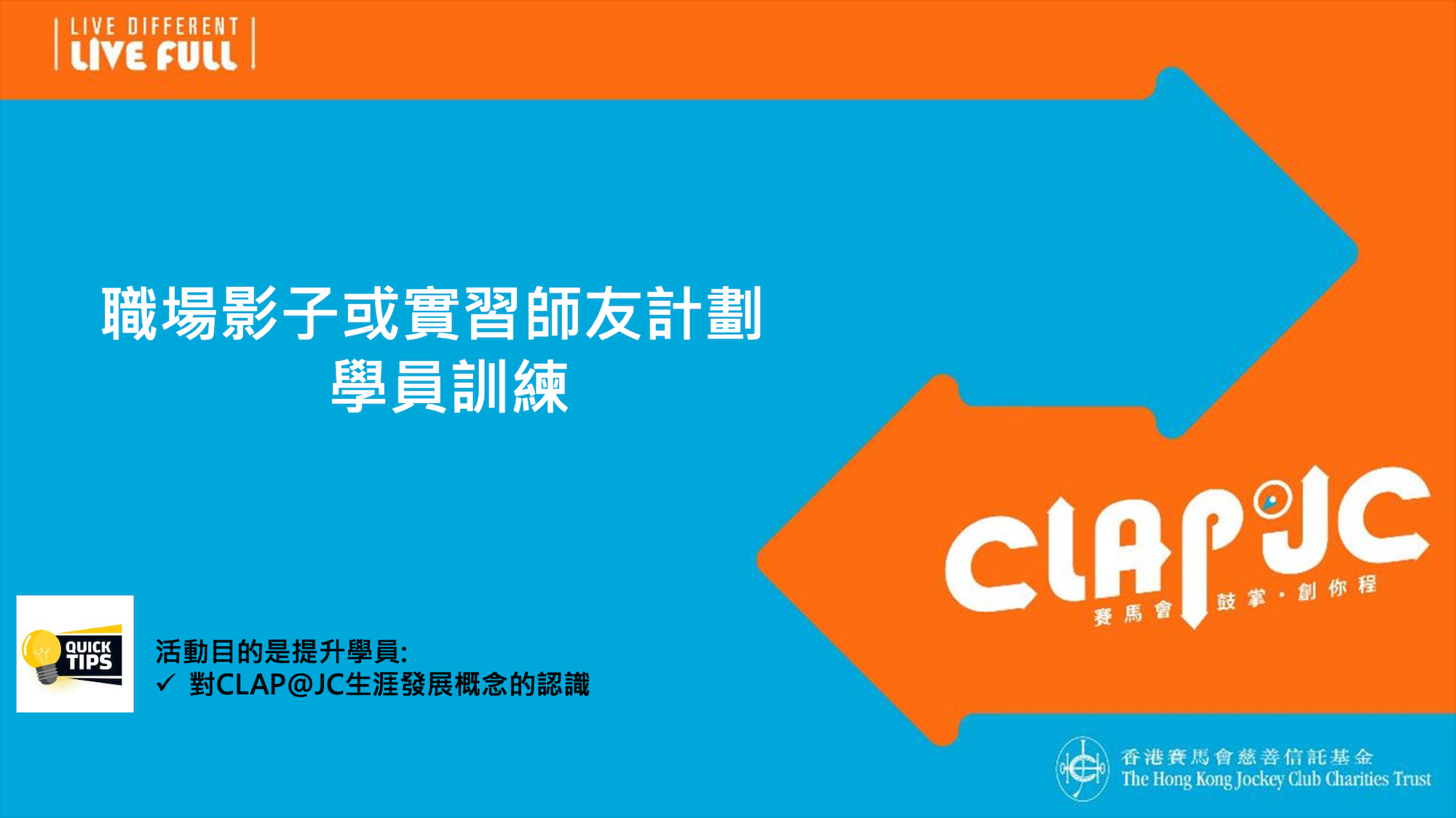 計劃邀請一眾工商企業創辦人、管理層等,成為年青人的友師,通過培訓提升友師對青年人文化的認識,了解青年價值願景,以及深化對CLAP@JC的生涯發展概念、框架及工具的認識。透過師友與青年的個別面見、工作坊及工作體驗,讓年青人可及早接觸工作世界,助他們更有系統地整理「延展工作」經驗,並進一步鼓勵各界持份者共同締造有利青年生涯發展的社區環境。